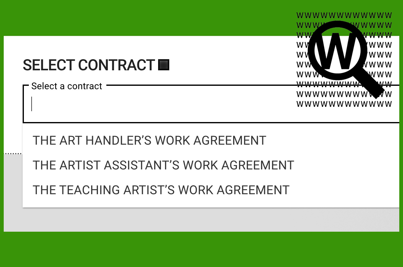Who is it for? Freelance art handlers, artist assistants, teaching artists and the galleries, nonprofit organizations, businesses, and agencies who contract their labor. Future agreements for art writers and critics, independent curators, paid interns and others are in development. The Contract Generator is accessible through WAGENCY for subscribing members. Read the announcement and learn more about this project here .